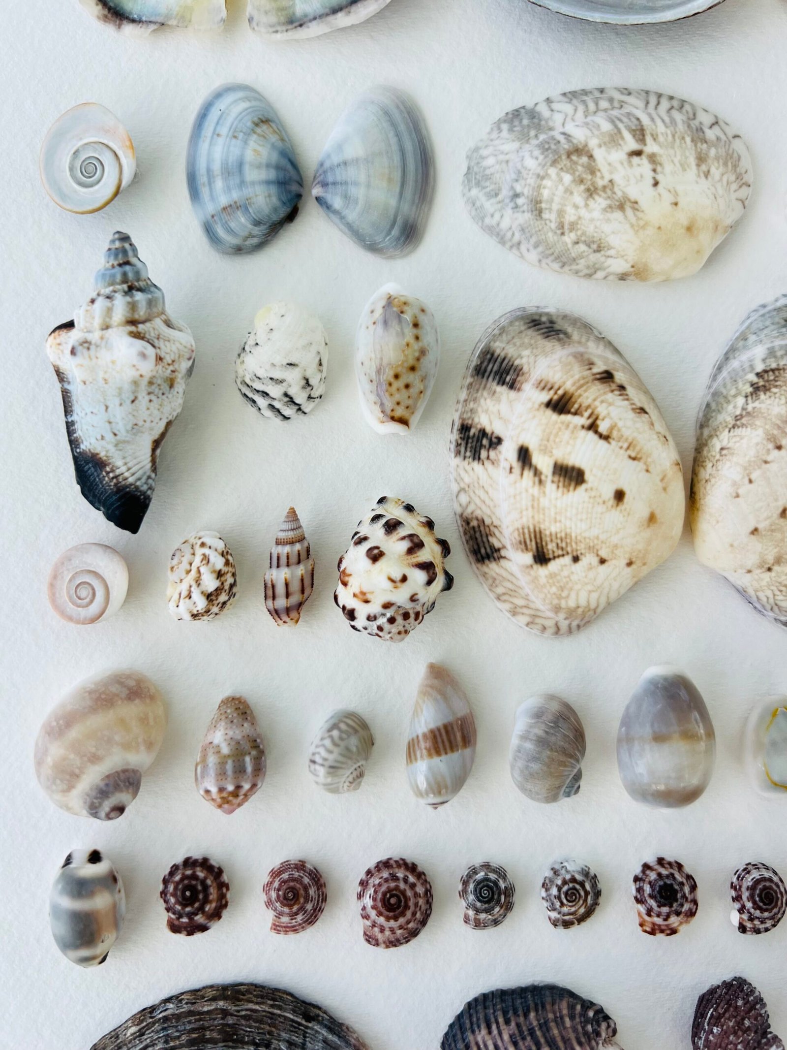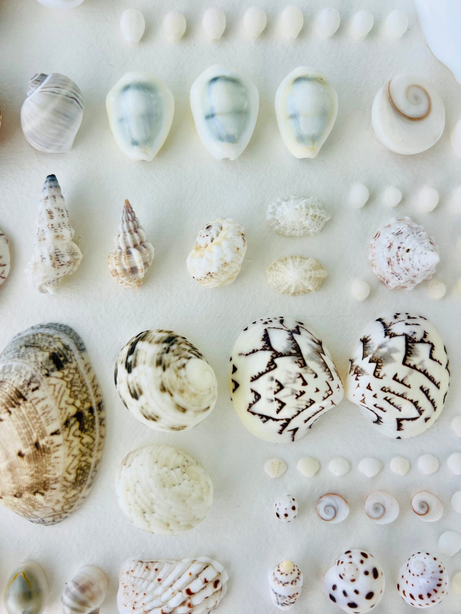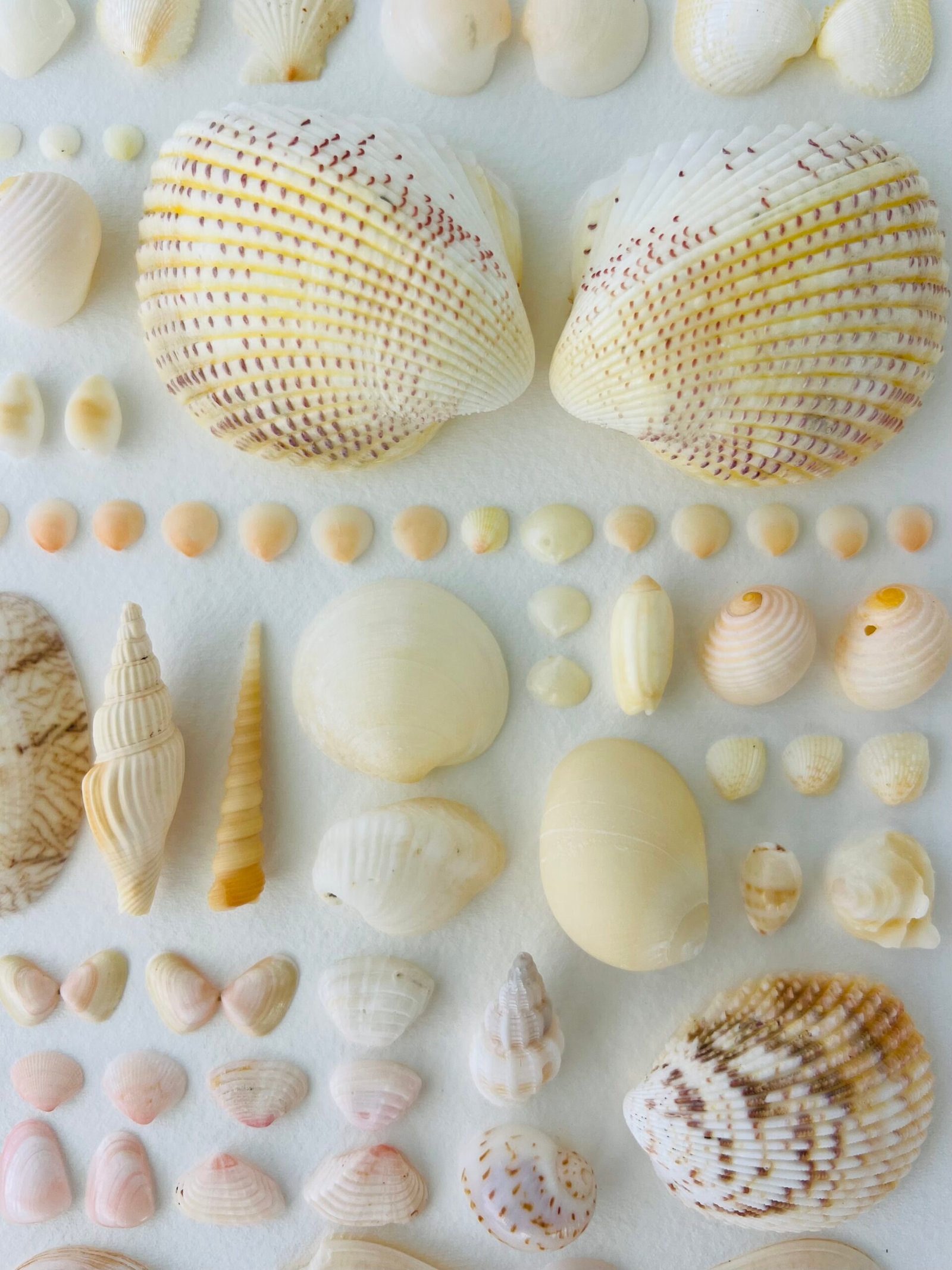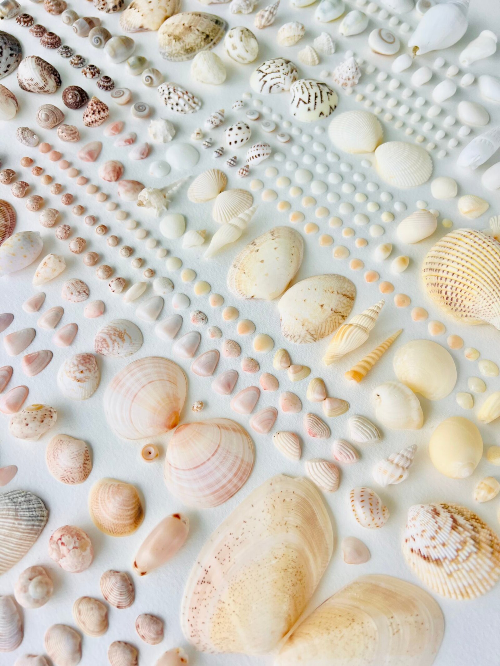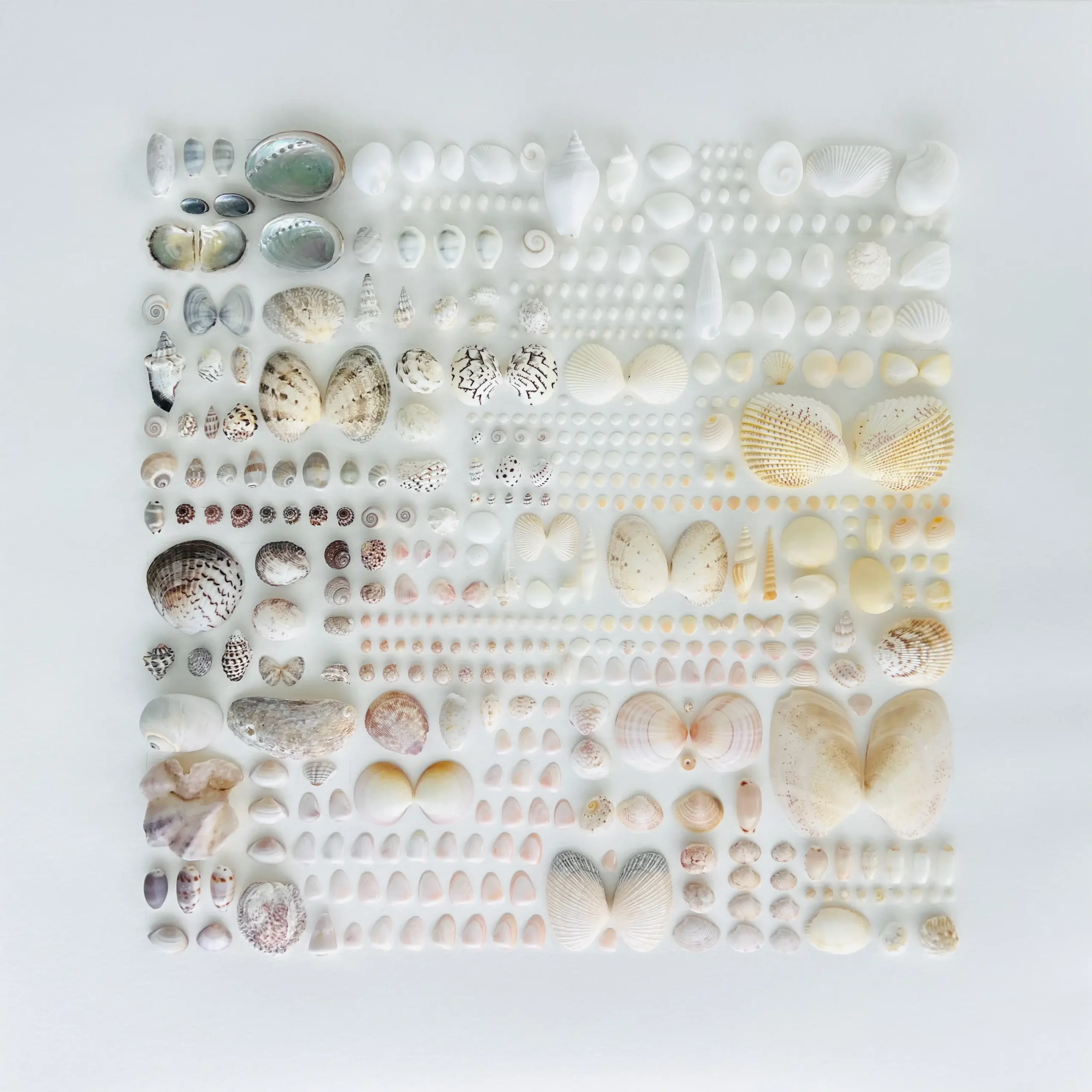Each shell is positioned in a grid-like formation, ordered by size, form, and hue, creating a visual rhythm reminiscent of both scientific specimen classification and modern conceptual art.